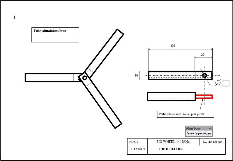 Pour cette réalisation, le plus long sera de faire les gabarits. Pour le gabarit de perçage du tube PVC aucun soucis. ![]() Dans un premier temps il faut assemblerle tube PVC et les croisillon. Puis faire les liaisons électriques des croisillons. ![]() ![]() ![]() La longueur est d’environ 5 cm. Pour la liaison croisillon PL châssis un bout de coax (RG58) d’une dizaine de centimètres. Quand tout est fait, il faut commencer par mettre les trèfles en place. le gabarit pour les treffles. ![]() des vis pour rendre solidaire les croisillons et les trèfles. ![]() Ensuite, j’ai ajusté l'impédance en coupant de quelques mm le strap à chaque fois. Attention quand on utilise l’analyseur MFJ, ne pas chercher la perfection car les mesures faites peuvent être incorrect ! ! Pour le matériel il faut acheter des tubes en aluminium normal brut et surtout vérifier que les tubes de 8 mm coulissent bien dans le tube de 10 mm. (sinon, passer un coup de foret de 8,1 mm à l’intérieur du tube de 10mm). Le trèfle tient dans les croisillons uniquement par friction. Pour le bras de fixation de l’antenne sur le mat, arrangez vous pour que le mat passe au milieu d’un trèfle. Matériel: - 6 tubes d aluminium brut de 8mm. - 1 tube d’aluminium brut de 10mm. - 1 mètre de coax 50 Ohms RG58 (6mm). - 1 tube PVC diamètre 80 mm. Prix de cette réalisation, environ 30 euros, prix d’une version commerciale, environ 78 euros ( Pour info, je viens d’en réaliser 2 pour le radio club, elles ont servi pour la coupe du REF, voir le résumé... ) ![]() J’ai utilisé 4 antennes big wheel pour le concours des points hauts en 2002 espacées de 1,2 mètres; DX fait à plus de 900 km ! Bonne bidouille à tous. Date de création : 16/03/2010 @ 12h12