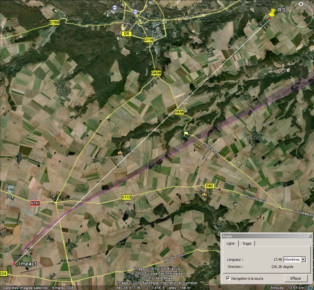 La radiosonde de Trappes est prévu dans le sud ouest du département de l’Essonne, je m’y installe. Vers 15.45h, le signal a du mal à bloquer le s/mètre du récepteur, ce n’est pas normal. Je décide d’aller à sa rencontre et peu de temps après, perte totale du signal. Je consulte mes notes et je remonte le dernier cap reçu. Une quinzaine de kilomètres plus loin,je retrouve le signal et finalement la radiosonde. Le parachute est emmêlé avec les restants du ballon d’où la dérive importante, elle a du descendre très rapidement.